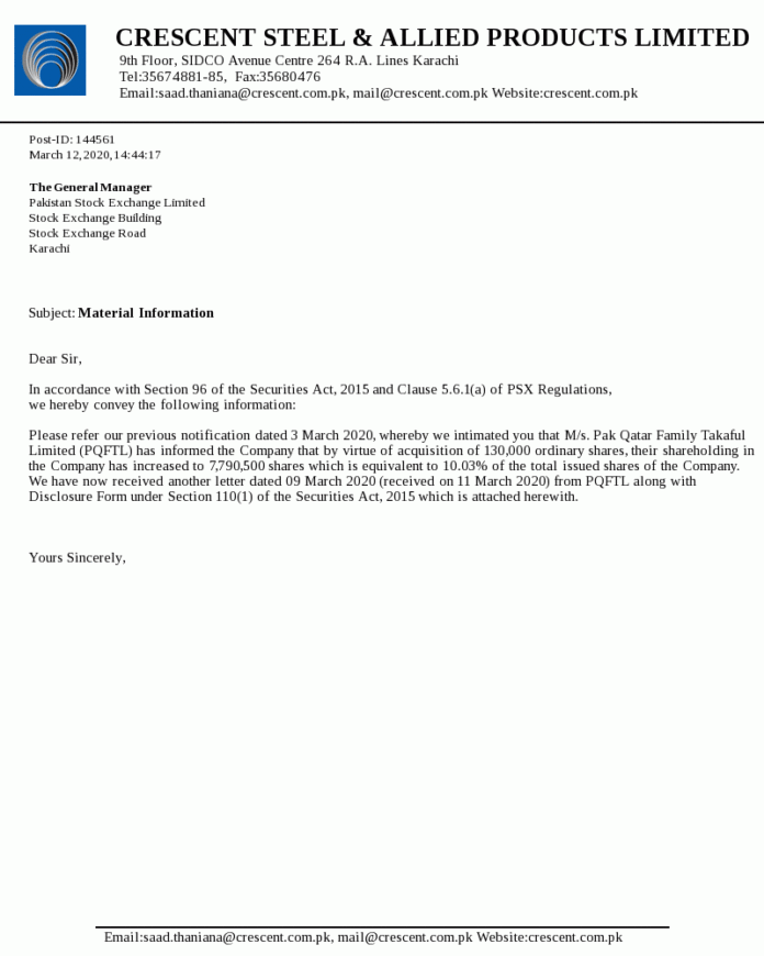 The Crescent Steel and Allied Product has disclosed that the shareholding of Pak Qatar Family Takaful Limited PQFTL in Crescent Steel and Allied Products Limited increased to 10.03 percent said the company in a statement to the Pakistan Stock Exchange on Friday.